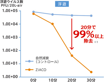 ※1 北生発2017_0385号 約6畳の試験空間でウイルス数の変化を測定 超音波噴霧器HM-201を【強】で実施。